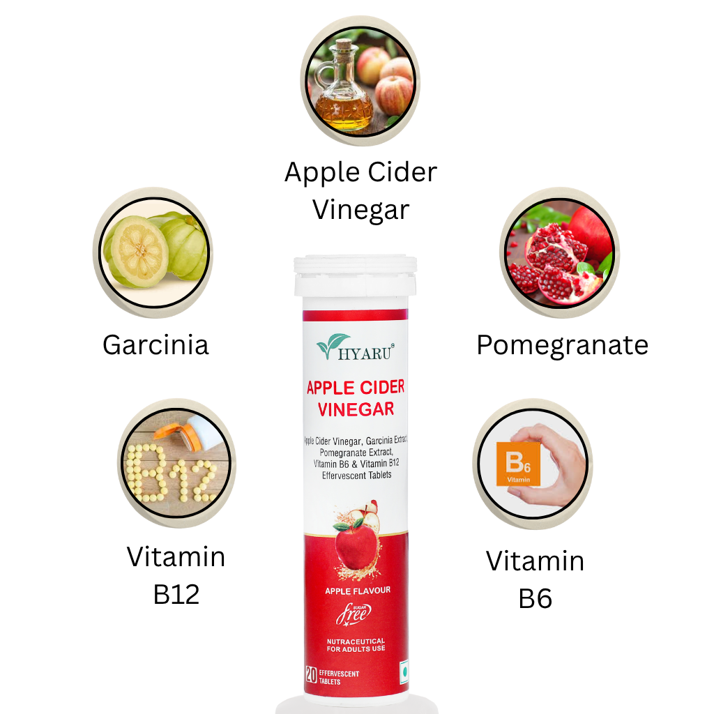 HYARU Apple Cider Vinegar Effervescent Tablets offer a modern and flavorful way to enjoy the age-old benefits of ACV, without the pungent taste or acidity. Each tablet is carefully formulated with Apple Cider Vinegar, Garcinia Cambogia Extract, and Pomegranate Extract, making it ideal for individuals looking to support digestion, Infused with Vitamin B6 and B12, these tablets help improve energy